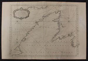 DESCRIPTION: 1764 detailed sea chart of the Grand Bancs and part of Newfoundland & 1767 detailed sea chart of northern part of Newfoundland and the mouth of the St. Lawrence River. Sunk into hand made thick laid paper measuring approximately 37½" x 25½".