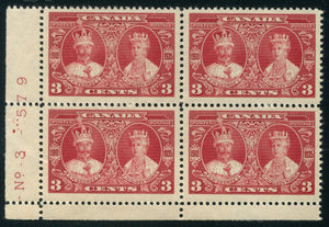 DESCRIPTION: 3c carmine, plate block of 4, plate 3, LL. NH.