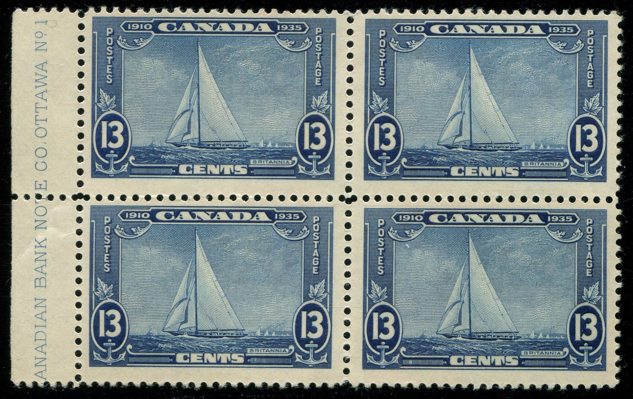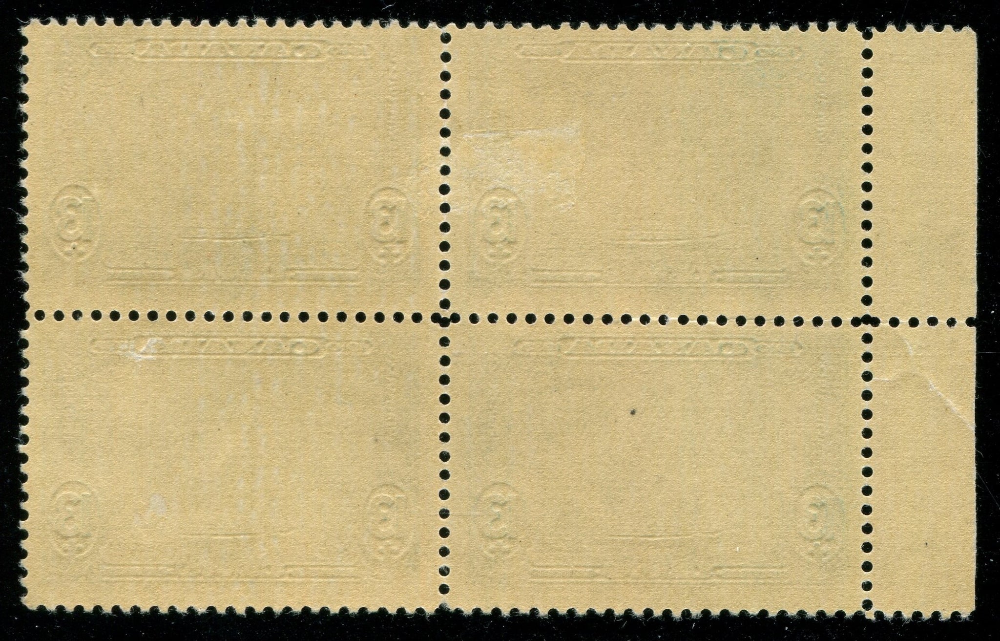 DESCRIPTION: 13c dark blue, block of 4, plate inscription at left. LH.