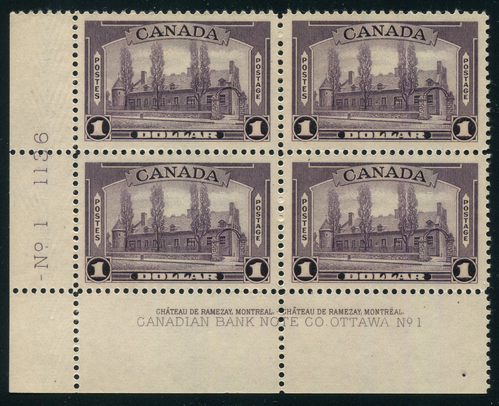 DESCRIPTION: $1 dull violet, plate block, plate 1, LL. VLH.