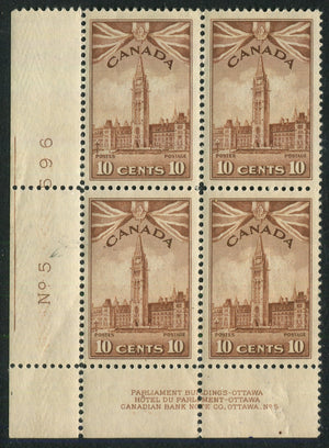 DESCRIPTION: 10c brown, plate block, plate 5, LL. HR, 2 stamps NH.