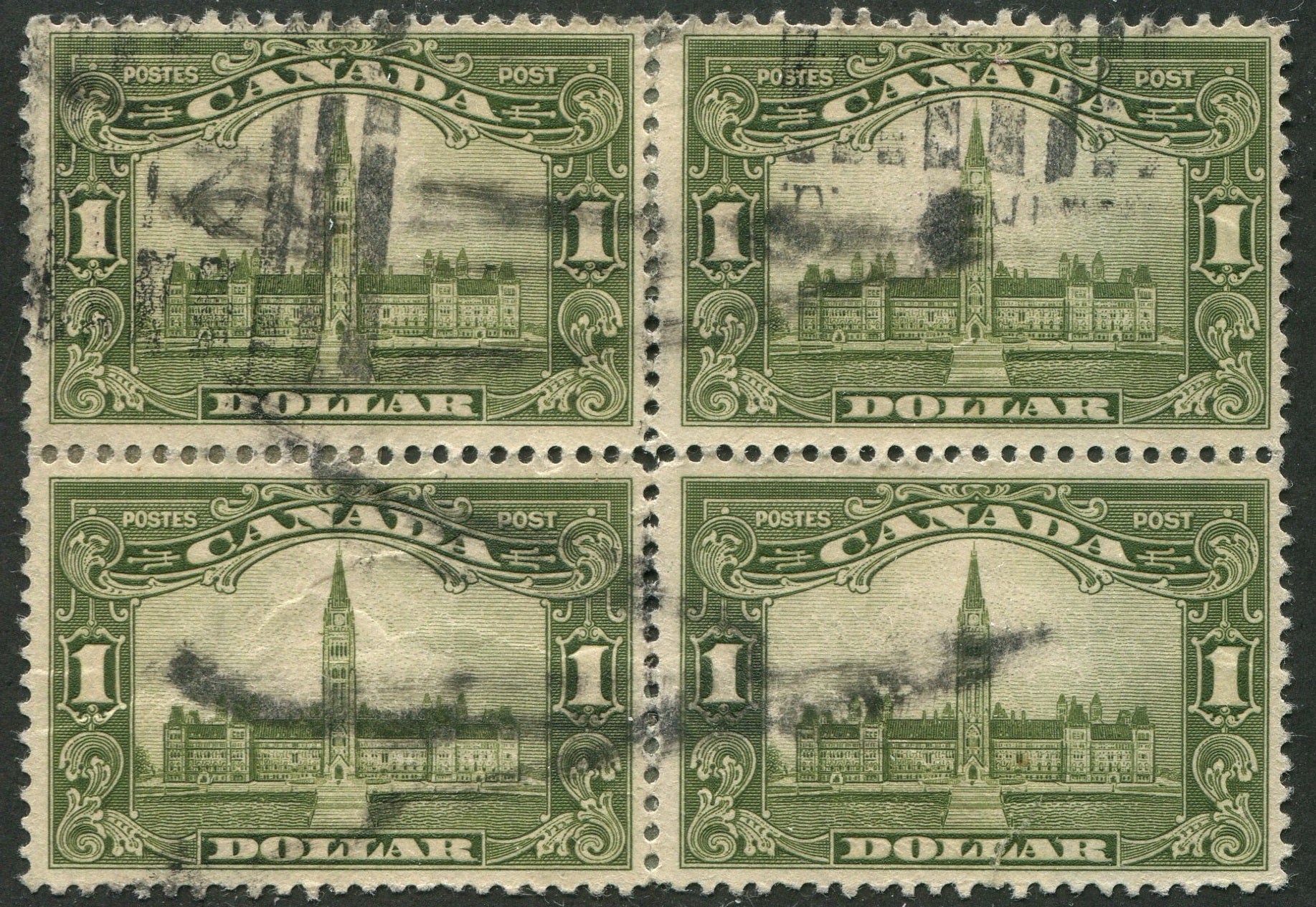 DESCRIPTION: $1 olive green, block of 4. Hinge supported.