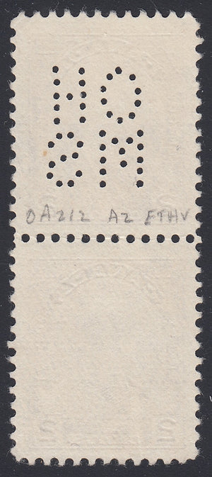 DESCRIPTION: 2c Duke of York, 5-hole OHMS, position 'A Z'. Vertical pair, 1 with perforations, 1 without. Unlisted. A 5-Hole OHMS showpiece.