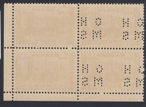 DESCRIPTION: 20c Fort Garry, 4-hole OHMS, position 'A Z', LH. Block of 4, 2 with perforations, 2 without. Most likely a unique OHMS item.