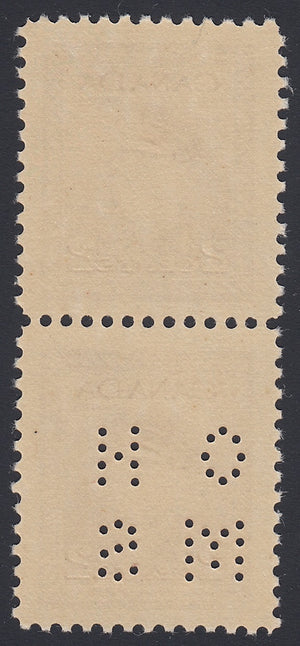 DESCRIPTION:2c brown, 4-hole OHMS, position 'A Z'. NH. Vertical pair, 1 with perforations, 1 without. Unlisted & scarce.