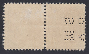 DESCRIPTION:2c brown, 4-hole OHMS, position 'E Z'. Horizontal pair, 1 with perforations, 1 without. Unlisted & scarce.