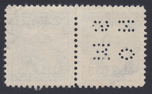 DESCRIPTION:5c deep blue, 4-hole OHMS, position 'E Z'. Horizontal pair, 1 with perforations, 1 without. CDS cancel. Rare. 1 stamp with tiny thin.