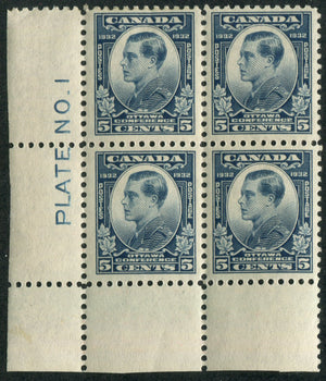 DESCRIPTION: 5c dull blue, plate block, plate 1, LL. NH, disturbed OG.
