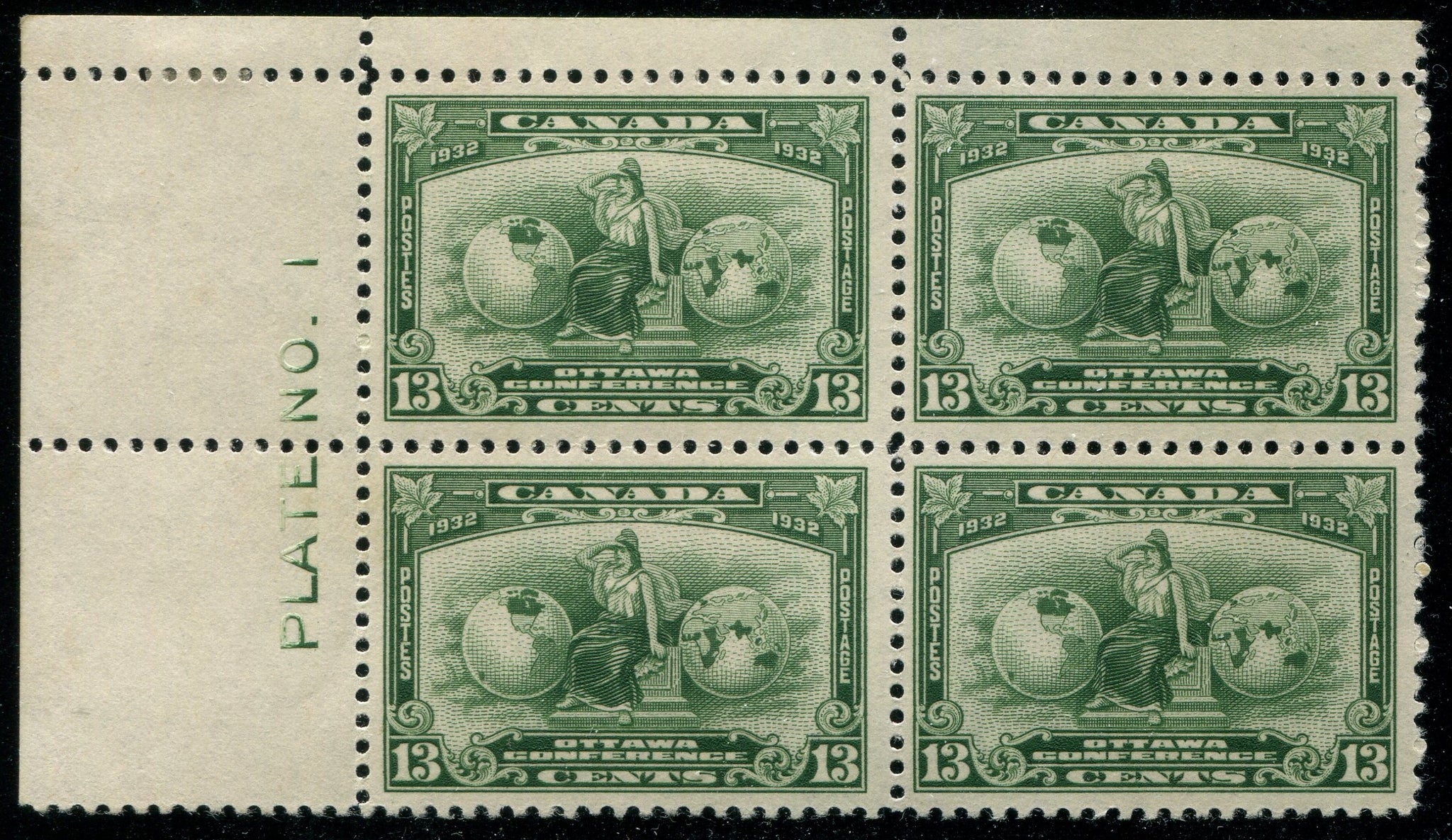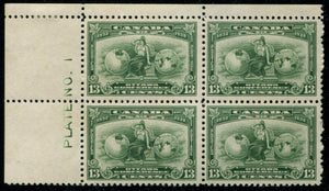 DESCRIPTION: 13c deep green, plate block, plate 1, UL. 1 LH, 3 NH.