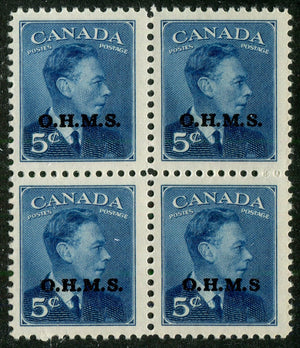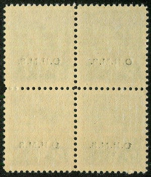 DESCRIPTION: 5c deep blue, block of 4, lower right stamp showing no period after 'S'. NH.