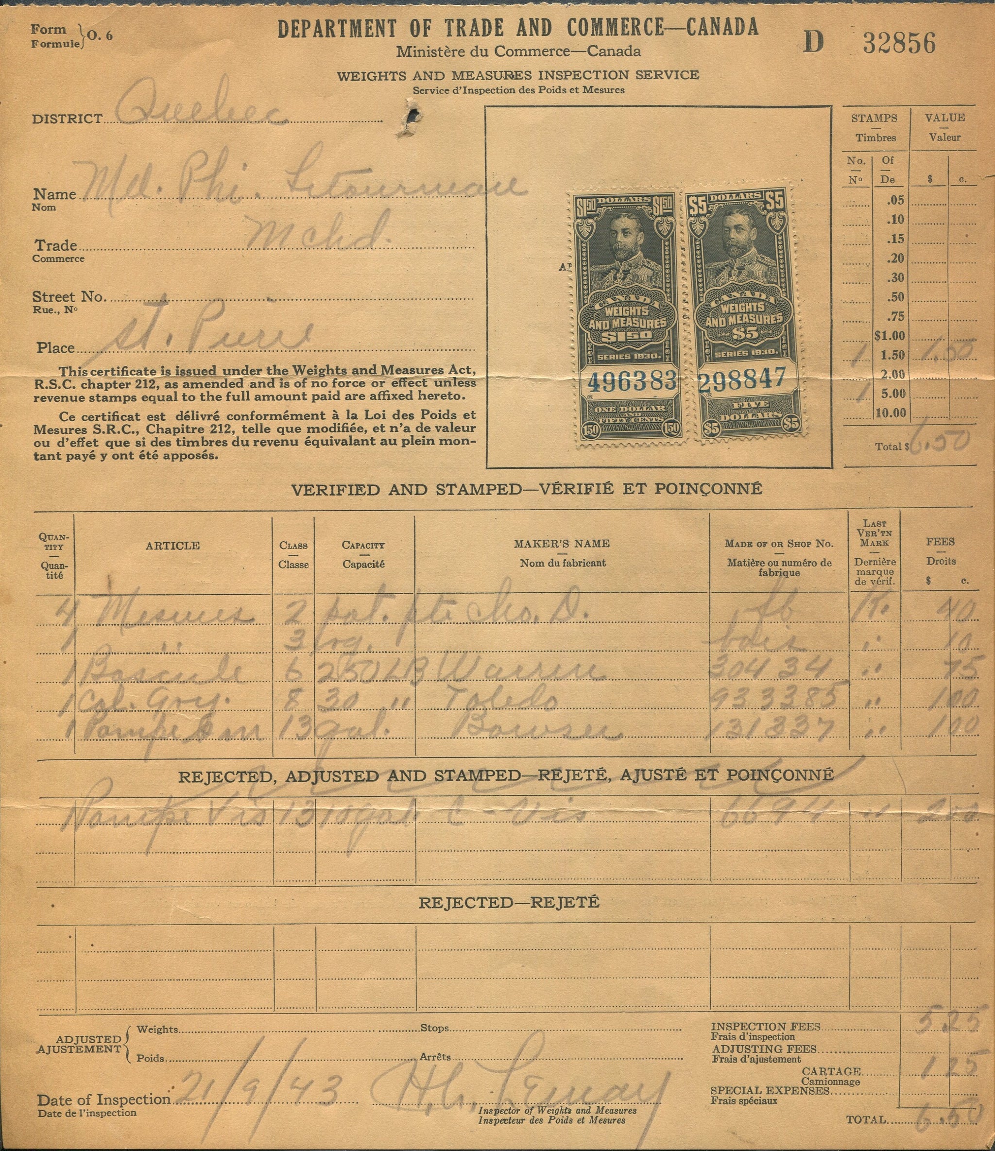 DESCRIPTION: FWM68 & FWM70 affixed to Weights & Measures Inspection Certificate. Dated SEP 21, 1943.