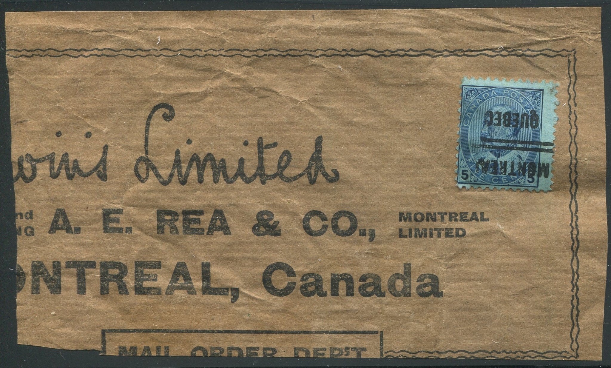 DESCRIPTION: 5c blue, invert. Used on piece. Scarce.