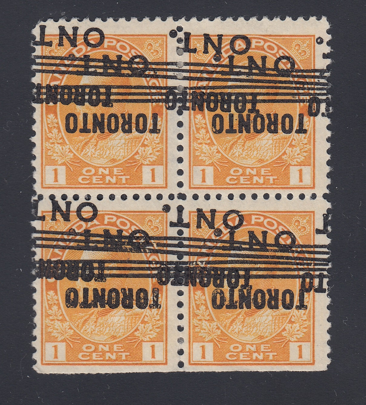 DESCRIPTION: 1c yellow, Die I, double invert. Rare block of 4. Full OG, 2 stamps. Gum thins.