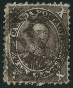 DESCRIPTION: 10c black brown. 4-ring numeral cancel '18' (Kingston, C.W., RF 2).